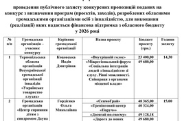 16 квітня 2026 року в каб. 230 Департаменту соціального захисту населення обласної військової адміністрації відбудеться відкритий захист конкурсних пропозицій поданих обласними громадськими організаціями осіб з інвалідністю на конкурс з визначення програм (проєктів, заходів), розроблених обласними громадськими організаціями осіб з інвалідністю, для виконання (реалізації) яких надається фінансова підтримка у 2026 році з обласного бюджету. Початок о 14:30 год. згідно графіка проведення публічного захисту. Відкритий захист конкурсної пропозиції здійснює керівник або уповноважений представник учасника …