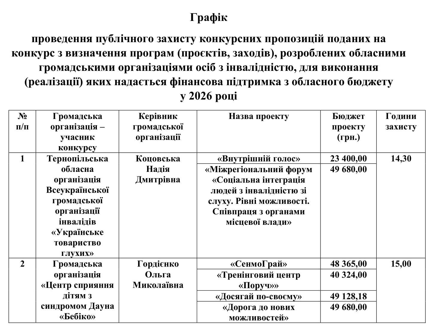 16 квітня 2026 року в каб. 230 Департаменту соціального захисту населення обласної військової адміністрації відбудеться відкритий захист конкурсних пропозицій поданих обласними громадськими організаціями осіб з інвалідністю на конкурс з визначення програм (проєктів, заходів), розроблених обласними громадськими організаціями осіб з інвалідністю, для виконання (реалізації) яких надається фінансова підтримка у 2026 році з обласного бюджету. Початок о 14:30 год. згідно графіка проведення публічного захисту.